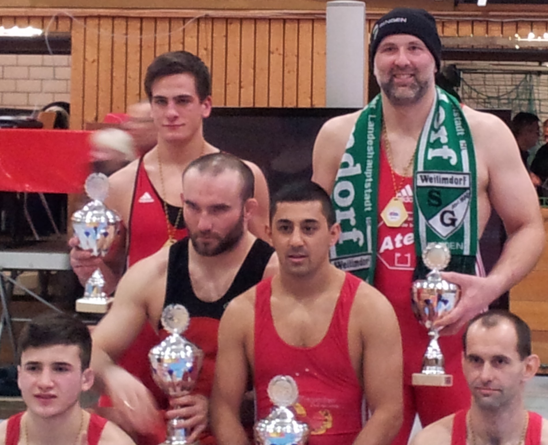 Gegen seine Kontrahenten Kai Wilimsky (Faurndau) und Bernd Hornikel (Ehningen) siegte der 36-jährige Weilimdorfer jeweils auf Schulter. Das Bild zeigt ihn im Kreise der anderen Württembergischen Meistern der weiteren Gewichtsklassen.