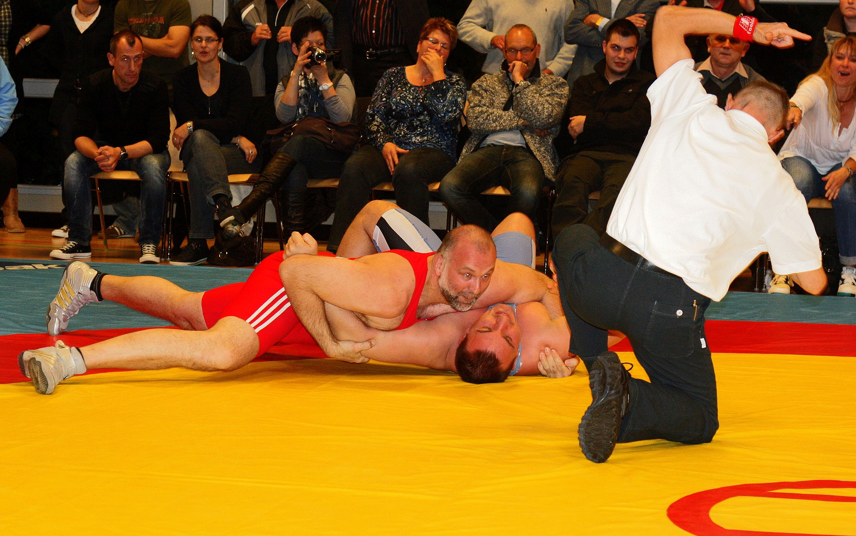 Den richtigen Startschuss in diese Begegnung gab aber Andreas Werft im Schwergewicht, der seinen eigentlich auch nicht zu unterschätzenden Gegner Jozef Apro bereits nach 20 Sekunden auf die Schultern legen konnte und danach sein traditionelles „Tänzchen“ aufführen konnte (SS 4:0, 5:3). Die Stimmung in der Halle schon zu diesem Zeitpunkt famos.